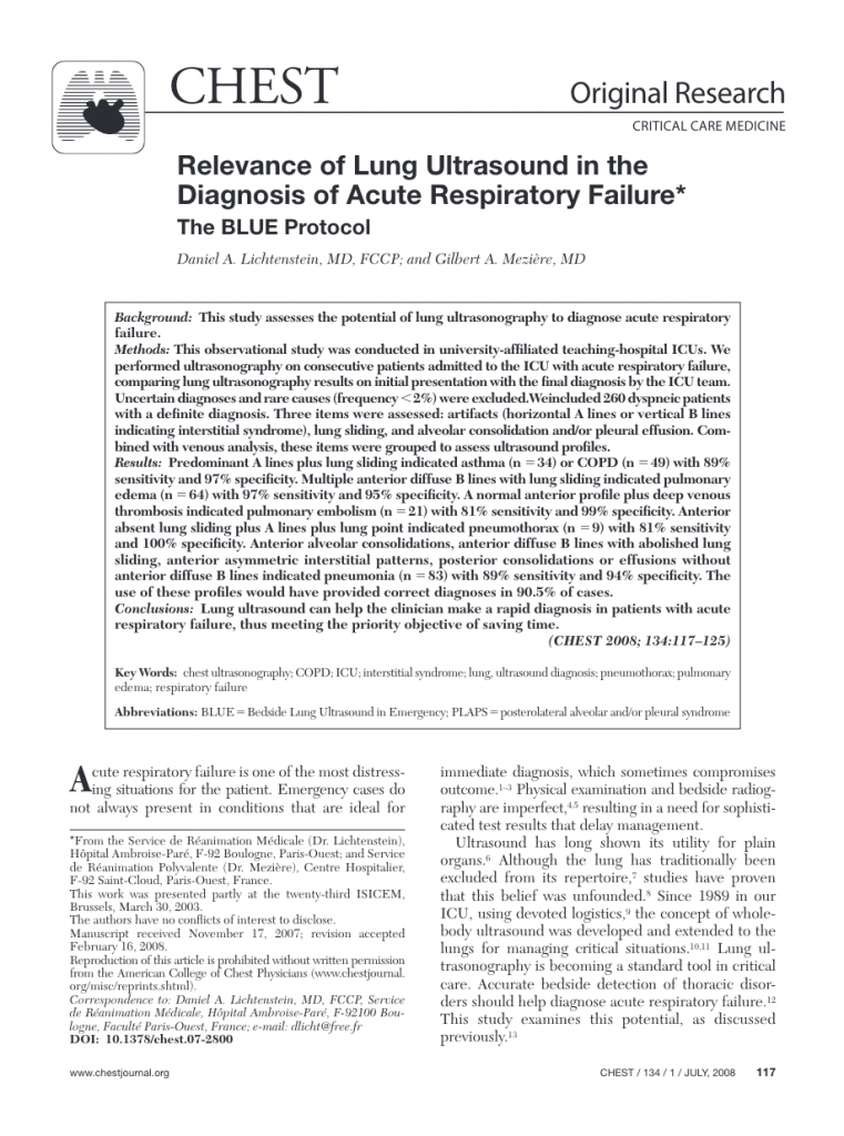 Lichtenstein DA, Mezière GA. Relevance of lung ultrasound in the diagnosis of acute respiratory failure: the BLUE protocol. Chest. 2008;134(1):117-125. doi:10.1378/chest.07-2800