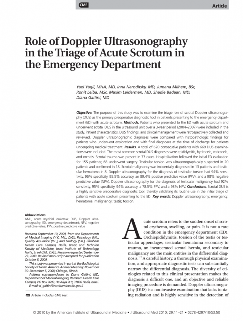 Yagil Y, Naroditsky I, Milhem J, et al. Role of Doppler ultrasonography in the triage of acute scrotum in the emergency department. J Ultrasound Med. 2010;29(1):11-21. doi:10.7863/jum.2010.29.1.11